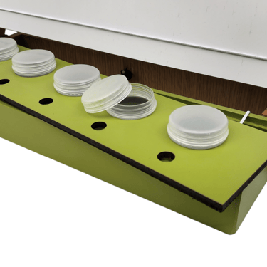 Cartuchera porta útiles con 5 recipientes a rosca para preparado de témperas y orificios para pinceles/lápices/fibras