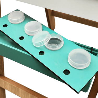 Pizarra blanca: Uso para imanes / Cartuchera porta útiles plegable con 4 recipientes a rosca para preparado de témperas y orificios para pinceles, lápices, fibras / Rotafolio para sujeción de papeles (admite hasta formato A3)