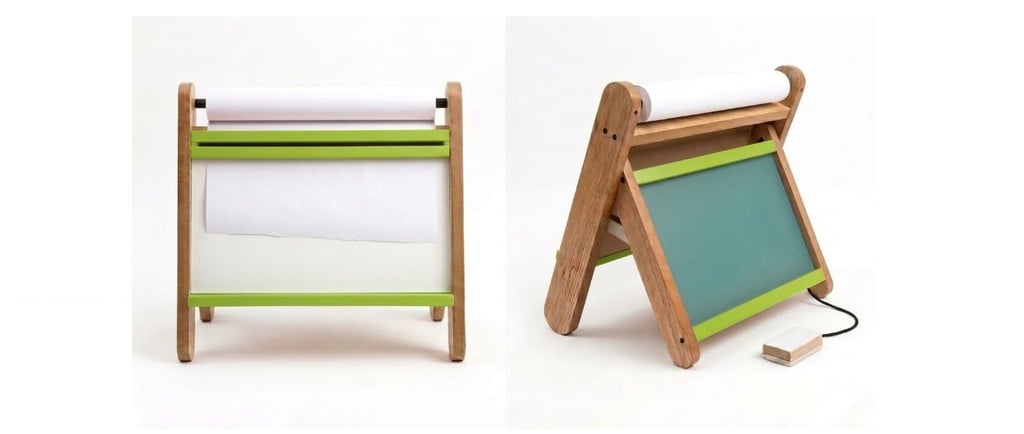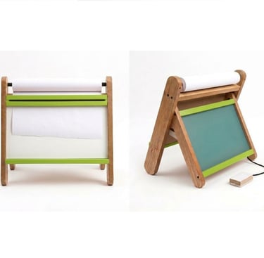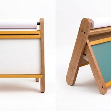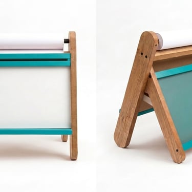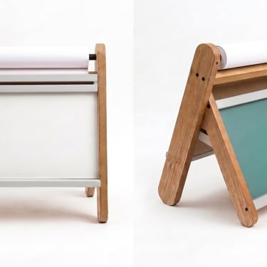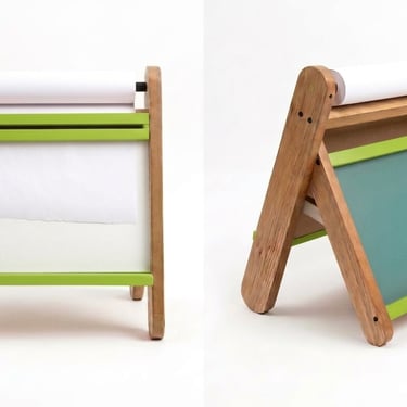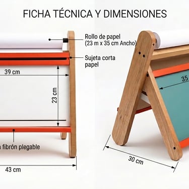 Este modelo cuenta con una pizarra blanca magnética para uso de piezas imantadas, y para expandir las posibilidades creativas, incorpora un sistema de rollo de papel continuo de 23 metros, ideal para el uso de marcadores, fibrones y témperas. Un lado verde para tiza, ofreciendo dos experiencias sensoriales diferentes en un solo objeto.