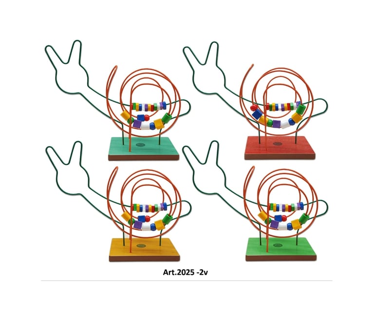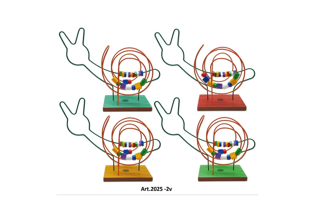 Juego para el desarollo de la motricidad fina.Posee piezas plasticas con diversas formas geométricas y colores, enhebradas sobre coloridos rieles metálicos. Todo se encuentra montado sobre una base de madera rectangular en cuatro colores (Amarillo / Rojo / Turquesa / Verde).