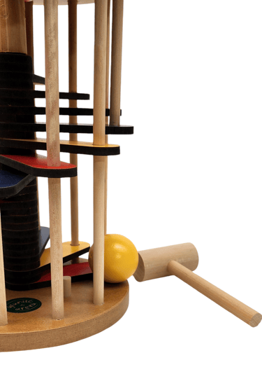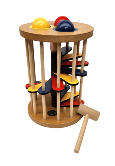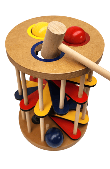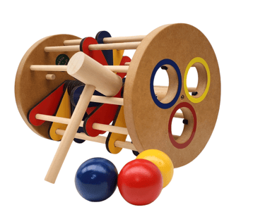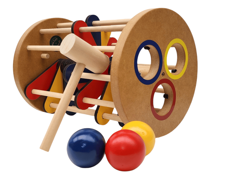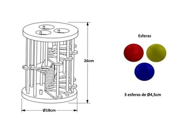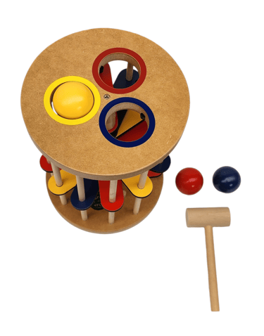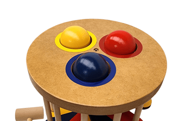 Contribuye a la Motricidad Gruesa de los niños, desarrollando grandes partes musculares, como brazos, abdomen y espalda, permitiendo de este modo erguir la cabeza, gatear, sujetar objetos con las manos, incorporarse, voltear y mantener el equilibrio. También aporta a la Motricidad Fina coordinando entre lo que ven los ojos y lo que las manos tocan, identificando colores. En la parte superior posee 3 orificios para incorporar las esferas, las cuales al presionarlas hacia abajo son descargadas por la parte inferior. Cada orificio y esfera está identificado con los colores primarios, esto no sólo le permite aprenderlos sino que también ayuda a coordinar cada esfera con el color correspondiente del orificio.